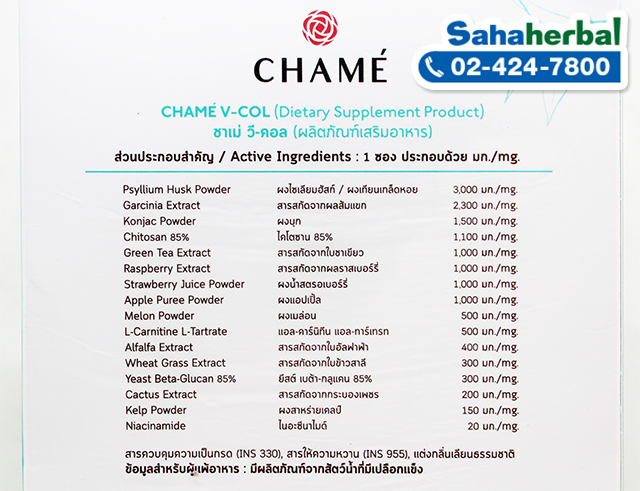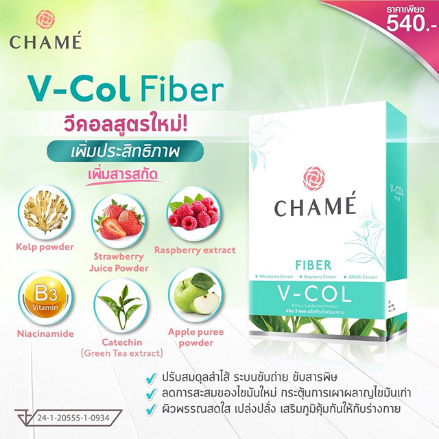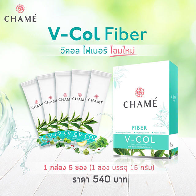 V Col วีคอล by Chame : อาหารเสริมไฟเบอร์สูตรใหม่ ช่วยในการขับถ่าย เป็นอาหารเสริมชนิดผงชงดื่ม รสชาติอร่อย รับประทานง่าย ช่วยขจัดสารพิษในร่างกาย ช่วยให้ผิวสวยใส ด้วยส่วนผสมจากเมล่อนญี่ปุ่น ทานง่ายกว่าแบบสกัดจากผักต่างๆ เห็นผลในเรื่องการขับถ่าย ช่วยในเรื่องการขับถ่าย ลดพุง ลดหน้าท้อง