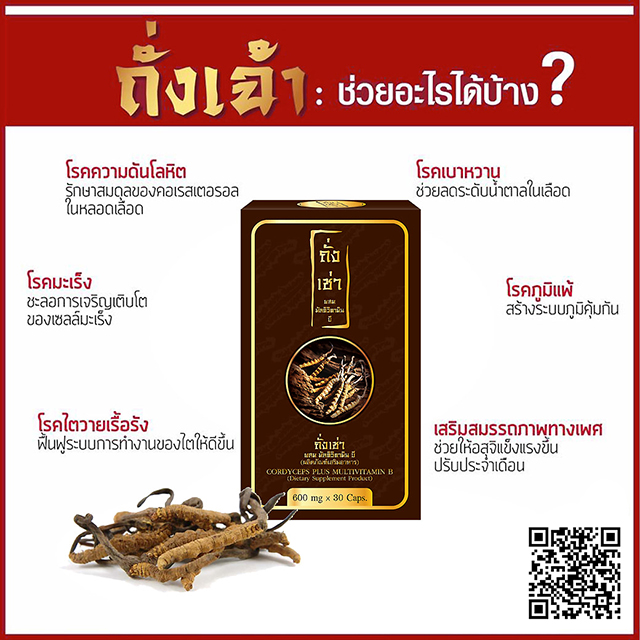 ถั่งเช่า ยิ่งยง Cordyceps Plus Multi Vitamin B ถั่งเช่าออร์แกนิค : สหเฮอร์เบิ้ลขอแนะนำ ผลิตภัณฑ์อาหารเสริมเพิ่มภูมิคุ้มกัน และมีความน่าจะเป็นในการลดการเติบโตของเนื้องอก และยั้บยั้งเซลล์มะเร็ง ลดระดับน้ำตาลในเลือด และโคเลสเตอรอล ไตรกลีเซอไรด์ (ไขมันในเลือด)