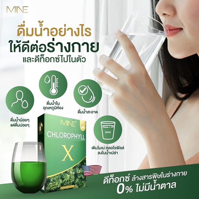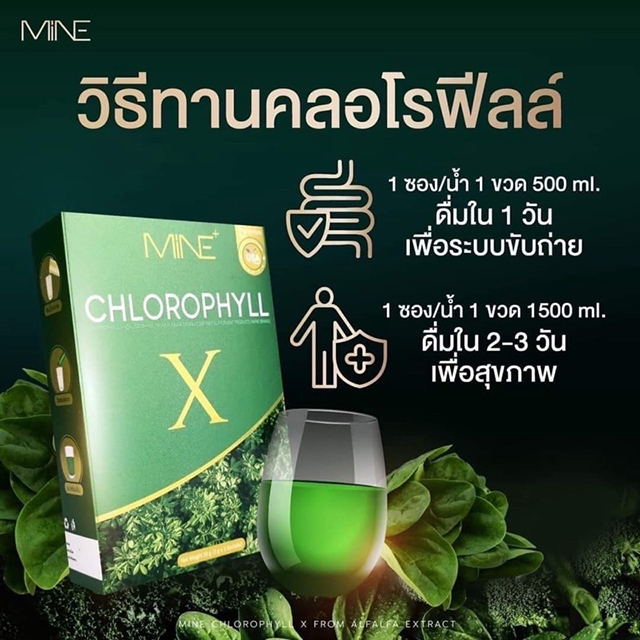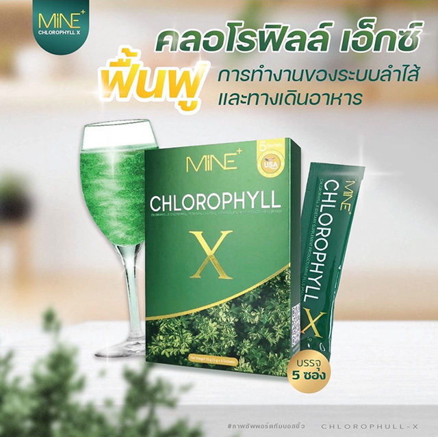 คลอโรฟิลล์เอ็กซ์ Mine Chlorophyll X ดีท็อก ล้างสารพิษ ในลำไส้ รีดไขมันส่วนเกิน หัวเชื้อ คลอโรฟิลล์ เข้มข้น 1 ซอง เท่ากับ ผัก 12 กิโล ดื่มง่าย ไม่เหม็นเขียว ช่วยขับล้างสารพิษต่างๆ ในร่างกาย เสริมภูมิคุ้มกัน บำรุงผิวพรรณ ให้สวยใสดูผิวแลชุ่มชื่น