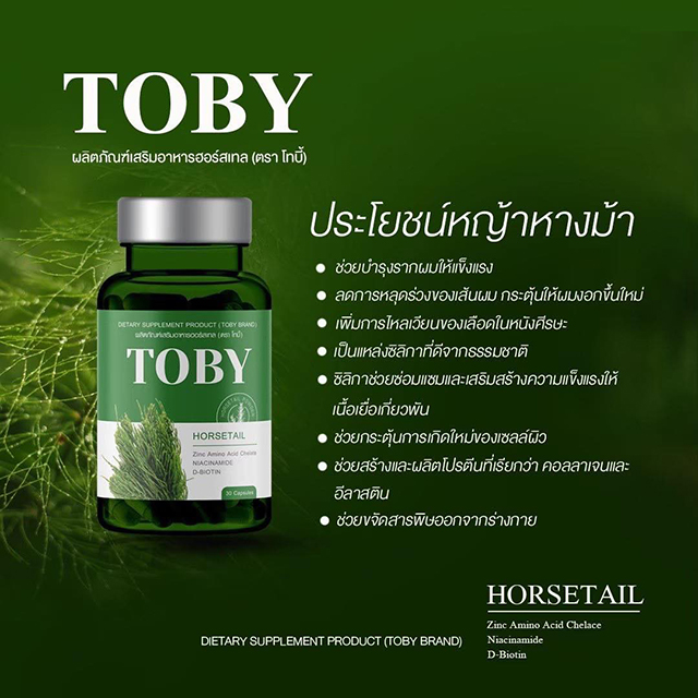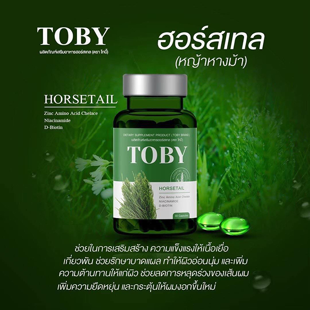 Toby Horsetail โทบี้ ฮอร์สเทล วิตามินบำรุงผม แก้ผมร่วง : สหเฮอร์เบิ้ลขอแนะนำ อาหารเสริมบำรุงเส้นผม ผมร่วง ผมบาง เล็บ สกัดจากสมุนไพรโบราณ ที่เเวดวงรู้จักกันเป็นอย่างดี  ว่ามีศักยภาพสูงมาก ในการบำรุง รักษา การเกิดผมร่วง